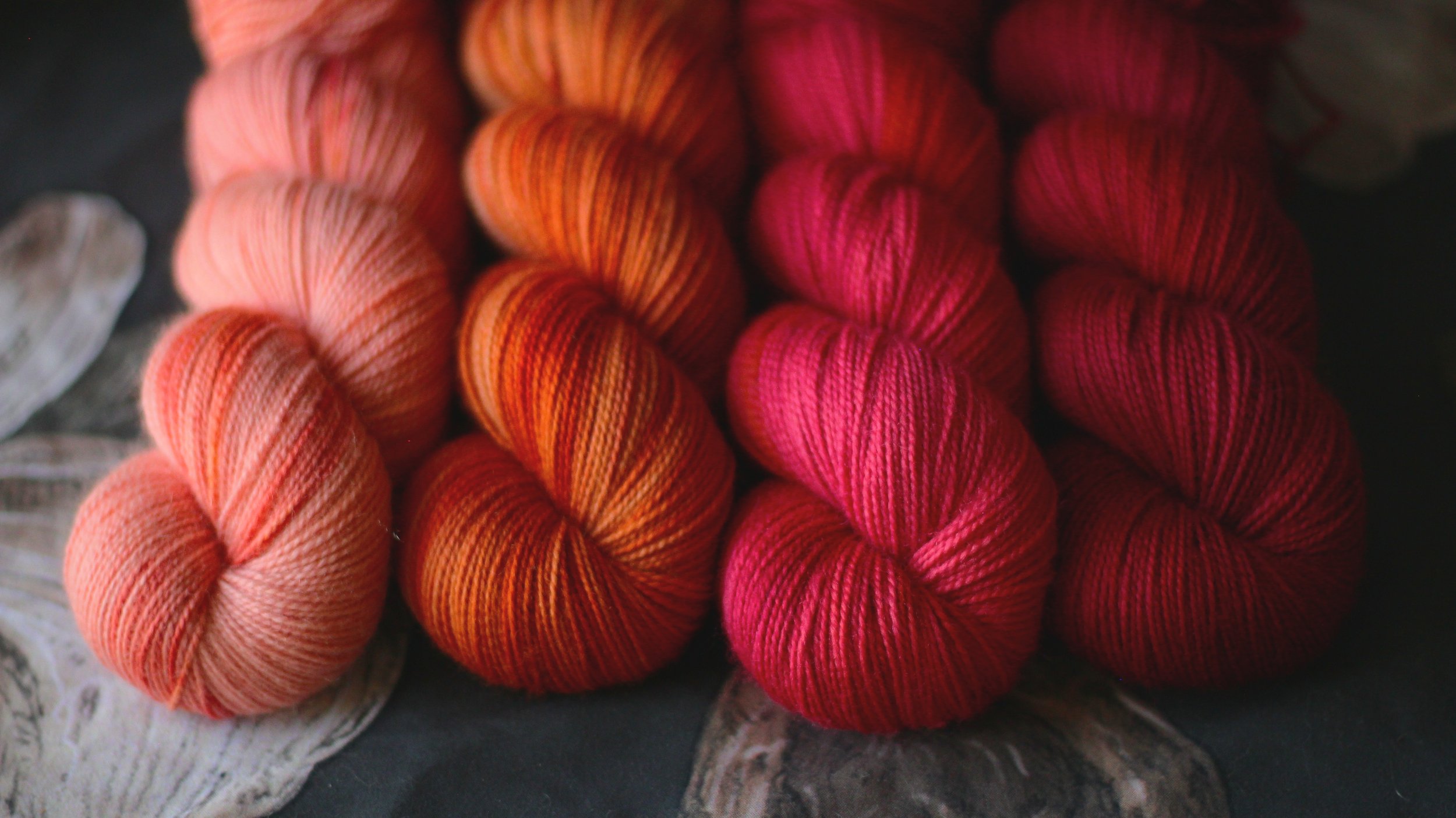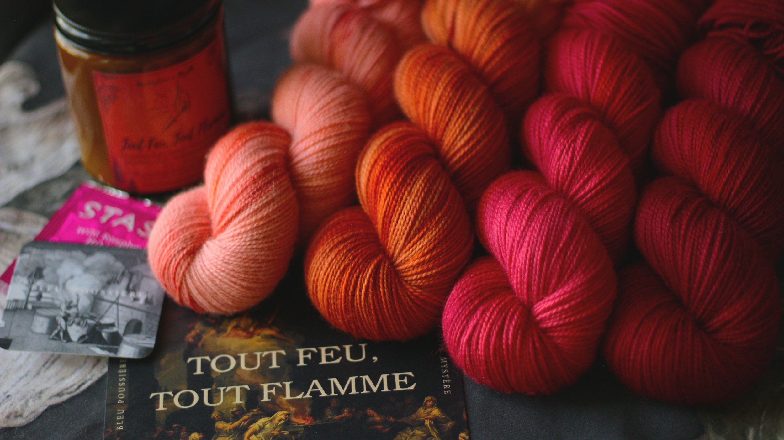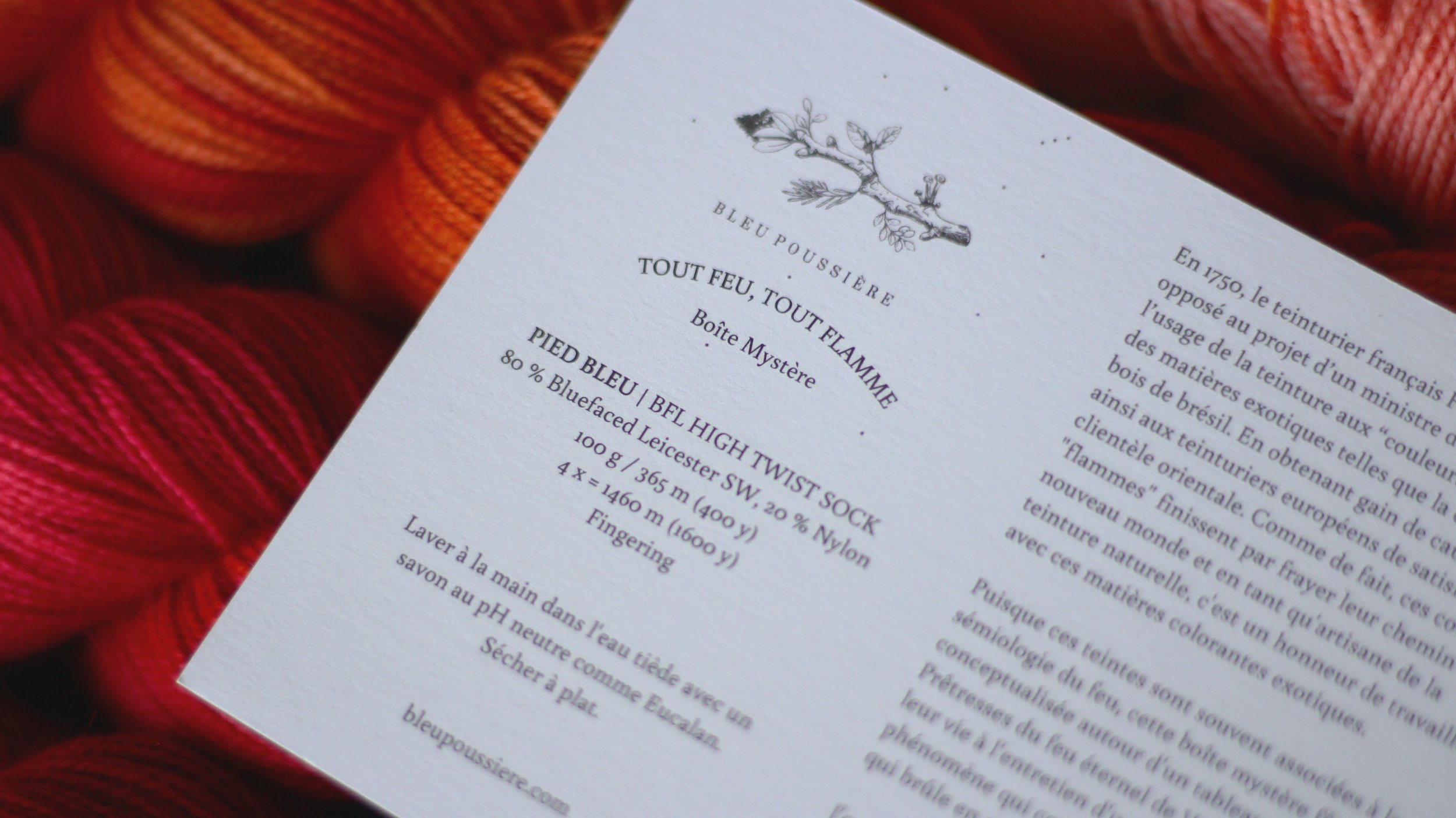 J’avais très hâte de trouver le temps pour vous dévoiler le résultat de ma dernière boîte mystère Tout Feu, Tout Flamme ! Livrée en Juillet dernier, j’ai eu énormément de plaisir à conçevoir ce genre de projet thématique. Cette fois-ci il s’agissait d’une boîte qui était disponible en précommande et qui contenait 4 écheveaux de la base Pied Bleu dans un camaïeu de couleurs chaudes teint naturellement. Mon inspiration a été l’histoire du teinturier français François Pinel qui en 1750, s’est opposé au projet d’un ministre du Roi interdisant l’usage de la teinture aux “couleurs de feu” avec des matières exotiques telles que la cochenille et le bois de brésil. En obtenant gain de cause, il permet ainsi aux teinturiers européens de satisfaire la clientèle orientale avec ces nouvelles teintes enflammées. Suivant de ce fait historique, j’ai également puisé mon inspiration dans le mythe des Vestales, gardiennes du feu sacré de Vesta, une flamme éternelle gardée religieusement et dont la représentation en peinture figure sur le carton accompagnant la boîte.