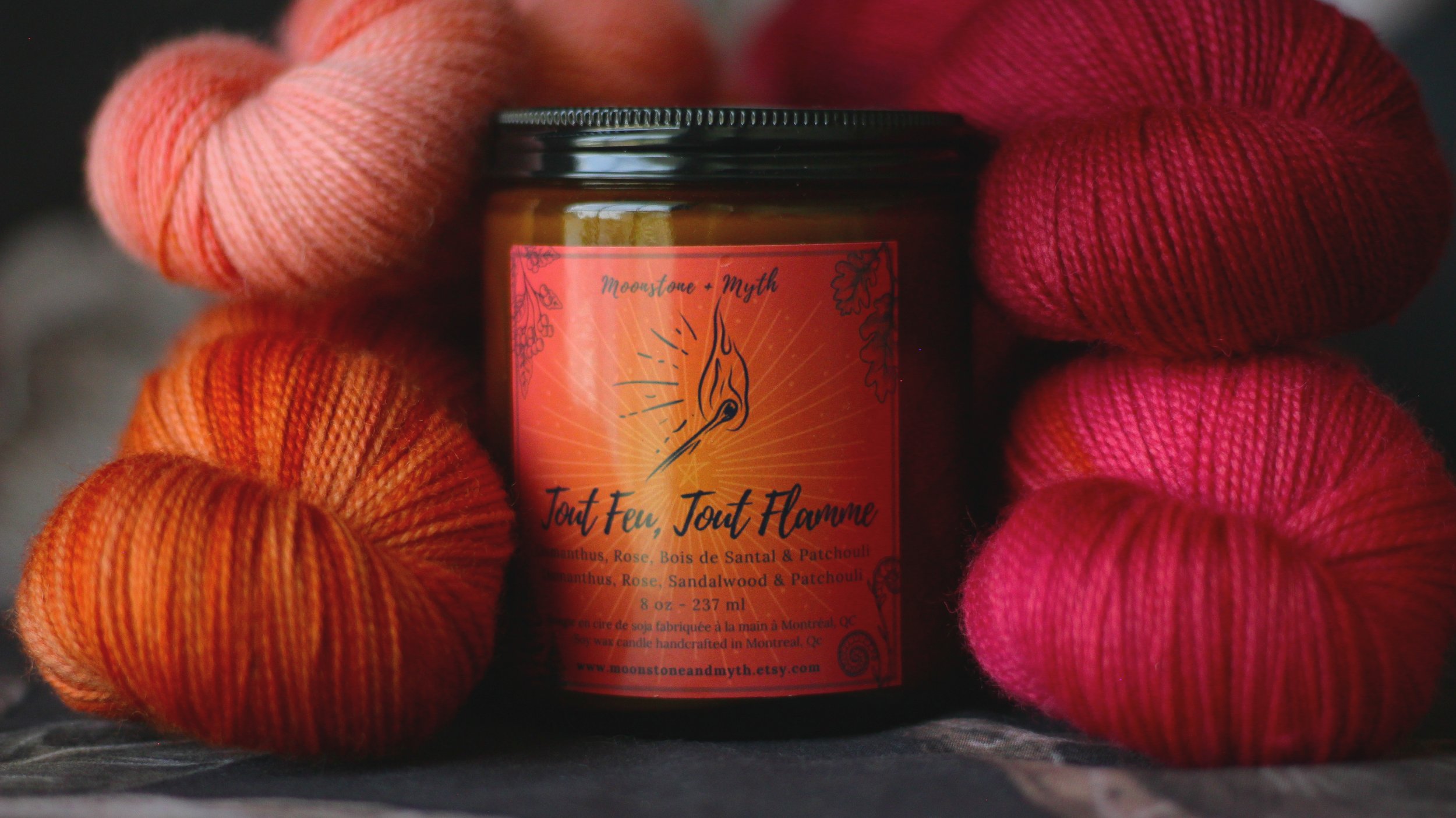 Pour encore plus raviver la flamme, j’ai eu le bonheur de collaborer à nouveau avec la tricoteuse Jen de Moonstone & Myth qui a confectionné une bougie sur mesure spécialement pour ce projet. J’espère que tous ceux qui ont précommandé la boîte sont aussi satisfaits du résultat que je le suis ! Il va sans dire que créer des univers laineux est ce qui attise le plus mon énergie créative, et c’est définitivement quelque chose que je compte continuer de vous proposer. Toutefois, ce genre de projet demande beaucoup de planification et c’est pourquoi je peux seulement les offrir en formule précommande. On me demande souvent si c’est possible d’acheter une boîte après le dévoilement et la réponse est non. Il est très rare que je sois en mesure d’en produire en extra, donc si c’est quelque chose qui vous intéresse je vous suggère de sauter sur l’occasion lorsqu’elle se présente. Sur ce, un gros merci à tous ceux qui continuent de choisir mes confections pour leur projets textiles, je suis choyée de pouvoir partager ma passion avec vous !