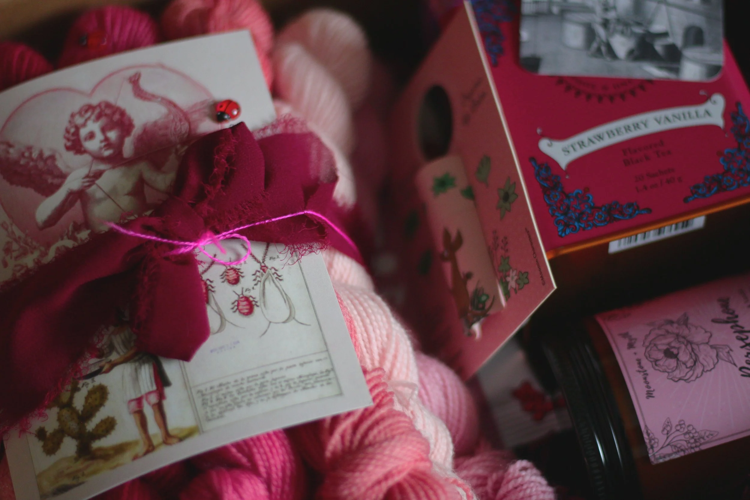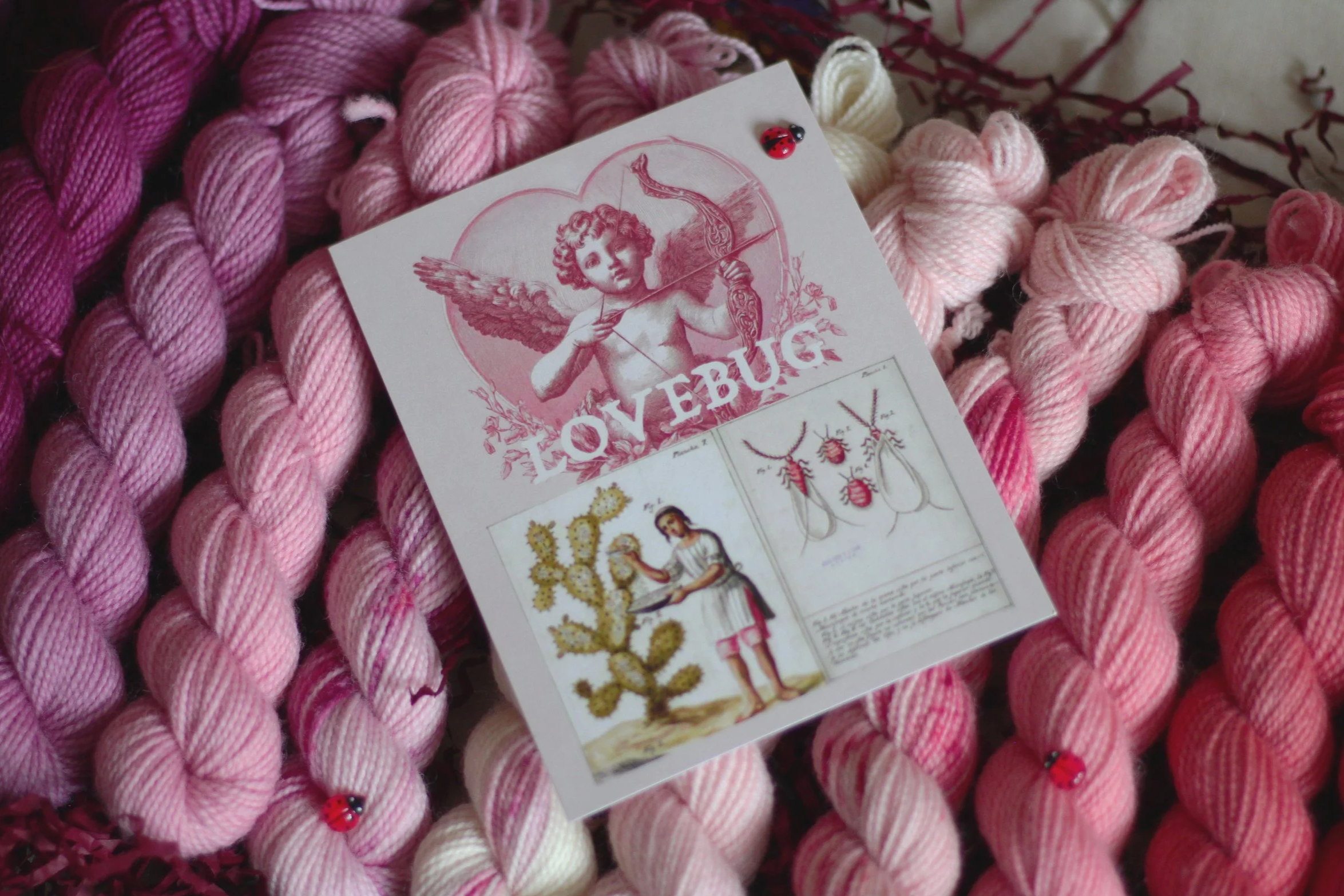 Pour la St-Valentin 2026, je vous ai proposé Lovebug, une boîte mystère de 12 minis écheveaux de la base Pied Bleu teints avec des cochenilles ; ce passionnant insecte qui permet de teindre naturellement d’illustres nuances de rouges, roses, et pourpres. Je suis bien enthousiaste d’enfin vous partager le dévoilement de ce projet qui a fait chavirer plusieurs tricoteuses !
